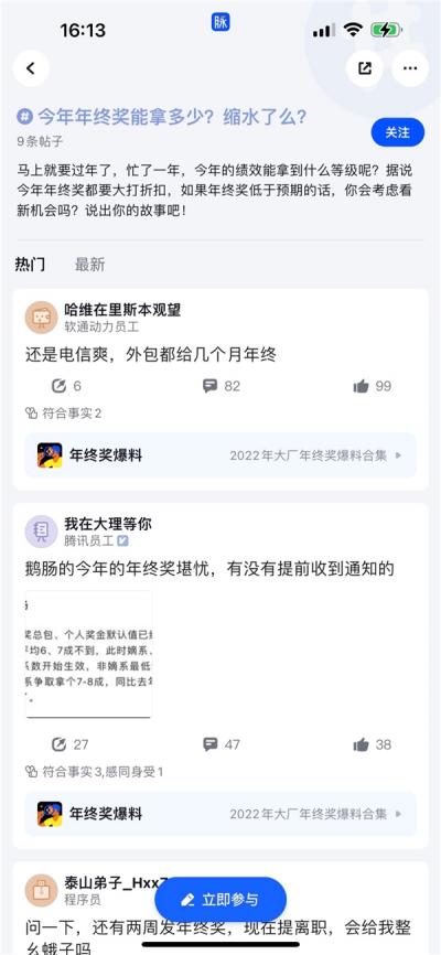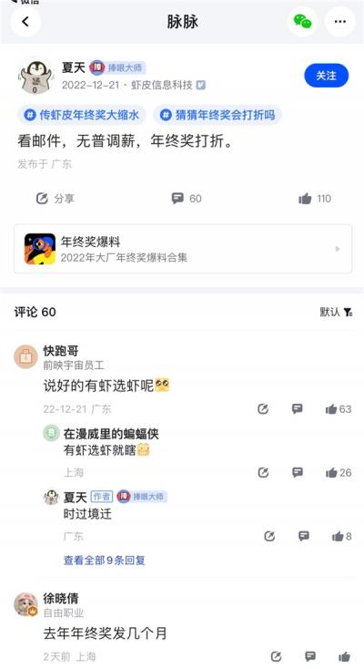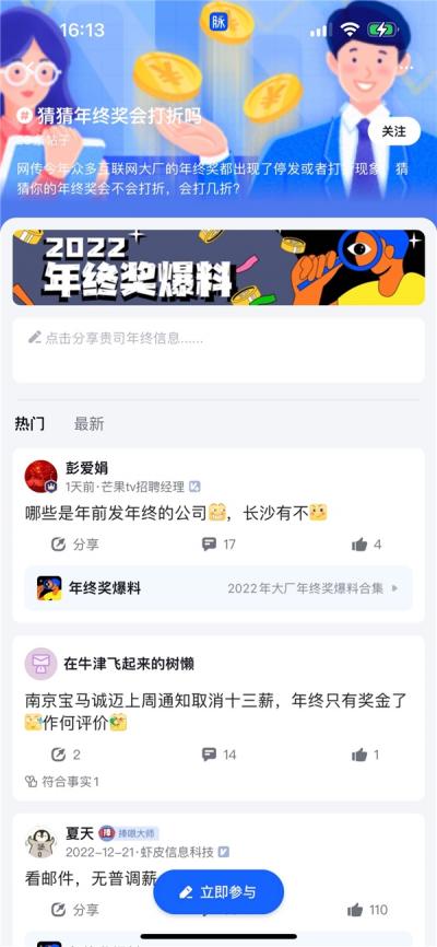 临近年关,面对2022年市场环境的诸多变化,企业普遍表示经营挑战增加、成本压力上升,相当一部分职场人面临今年可能与年终奖“失之交臂”或年终奖缩水。不少职场人在职场社交平台脉脉上发起了关于年终奖的各种话题,引发用户关注。