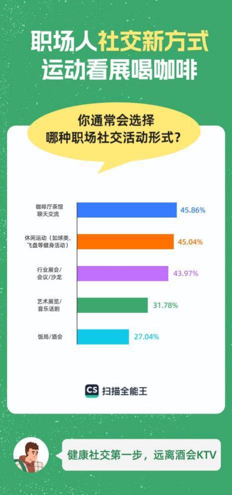 《报告》显示,超4成的受访者会选择在一个安静的地方聊天交流,例如咖啡厅、茶馆、飞盘等休闲运动,或行业展会、沙龙等“知识密集”型活动,都是职场人的热门社交方式。