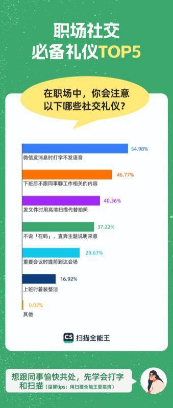 坦诚、高效是职场社交的“礼仪”。《报告》显示,54.98%的受访对象会注意“微信发消息时打字,不发语音”;37.22%的受访者表示,与人沟通时直接说明来意,而不是一句让人摸不着头脑的“在吗”,是职场社交礼节的体现。此外,交换双方企业、个人信息时,突然收到高糊画质的文件或图片无疑是令人头痛的,“用高清扫描代替拍照来发送文件”也因此被超过4成的受访者提及。由此可见,职场社交和工作场景一样,也讲究效率为先。
