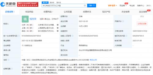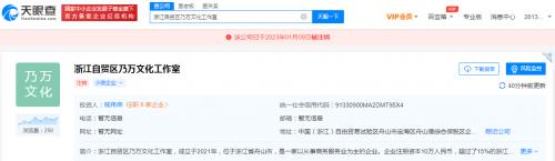 天眼查App显示,近日,浙江自贸区乃万文化工作室经营状态由存续变更为注销。该工作室成立于2021年2月,为歌手乃万(赵馨玥)工作室运营主体,投资人为钱伟荣,经营范围含文艺创作;组织文化艺术交流活动;个人商务服务;项目策划与公关服务等。