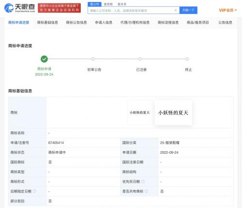 天眼查App显示,今年9月,上海美术电影制片厂有限公司已申请注册“小妖怪的夏天”商标,国际分类包括健身器材、教育娱乐等,目前商标状态均为申请中。