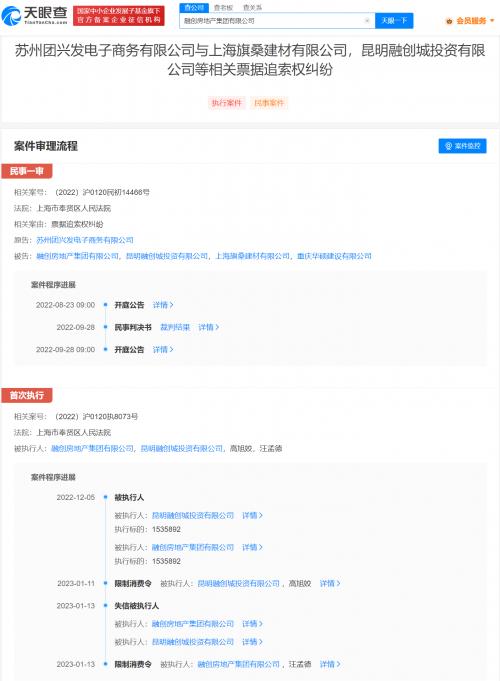 天眼查App显示,近日,融创房地产集团有限公司因拒不履行生效法律文书确定的义务(支付153万余元及迟延利息),被列为失信被执行人,同时被限制消费,执行法院为上海市奉贤区人民法院。案件详情显示,该案涉及苏州团兴发电子商务有限公司与昆明融创城投资有限公司、融创房地产集团有限公司、上海旗桑建材有限公司等相关票据追索权纠纷。去年12月,融创房地产集团有限公司、昆明融创城投资有限公司首次被执行。