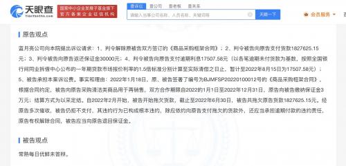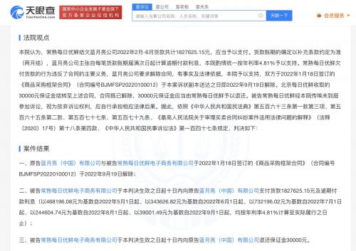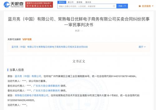 天眼查App显示,近日,蓝月亮(中国)有限公司、常熟每日优鲜电子商务有限公司买卖合同纠纷民事一审判决书公开。