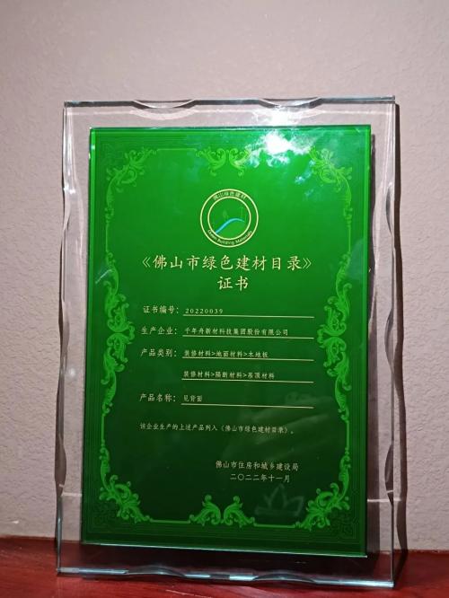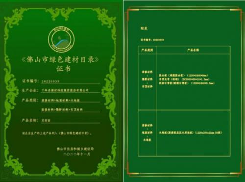 此前,经过第三方严谨审核,千年舟难燃胶合板、木地板、轻钢龙骨、纸面石膏板等产品符合相关绿色建材认证标准,获得《佛山市绿色建材目录》证书。