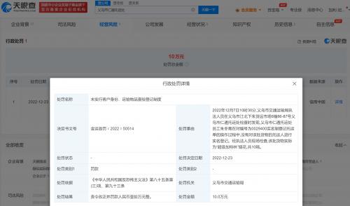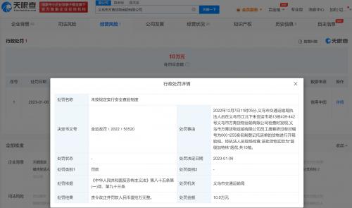 天眼查App显示,近期,义乌多家货运公司因未实行客户身份和运输物品查验登记制度,分别被义乌市交通运输局罚款10万元。处罚事由显示,当事人员工未对托运人信息、货物名称进行实名登记、未对货物开箱验视,经检查,运输货物实际为“超级加特林”烟花。