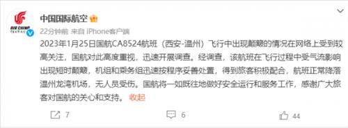 2023年1月25日国航CA8524航班(西安-温州)飞行中出现颠簸的情况在网络上受到较高关注,国航对此高度重视,迅速开展调查。