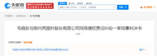 天眼查App显示,近日,毛晓彤与柳州两面针股份有限公司网络侵权责任纠纷一审判决文书公开。