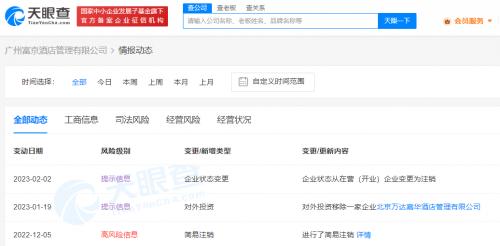 天眼查App显示,近日,广州富京酒店管理有限公司发生工商变更,企业经营状态变更为注销,同时该公司退出北京万达嘉华酒店管理有限公司股东。