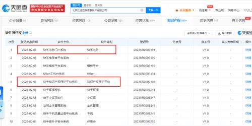 天眼查App显示,近日,北京达佳互联信息技术有限公司登记“快手法务门户系统”“快手知识产权保护平台系统”等多个软件著作权获批,当前版本号均为V1.0。