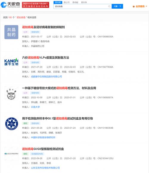 天眼查App显示,我国诺如病毒相关专利申请信息有180条,包括“诺如病毒及冠状病毒复制的抑制剂”“六价诺如病毒VLPs疫苗及其制备方法”“一种基于糖信号放大模式的诺如病毒检测方法、材料及应用”等,申请人包括多家研究所、大学、医药公司。