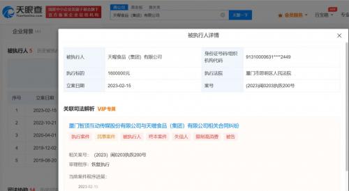 天眼查App显示,2月15日,天喔食品(集团)有限公司新增一则被执行人信息,执行标的160万元,涉及合同纠纷案件,执行法院为厦门市思明区人民法院。