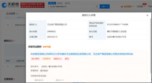 天眼查App显示,近日,肇庆万达度假区投资有限公司及其母公司万达地产集团有限公司新增一则被执行人信息,执行标的29.6万余元,涉及案件为承揽合同纠纷,执行法院为肇庆市鼎湖区人民法院。