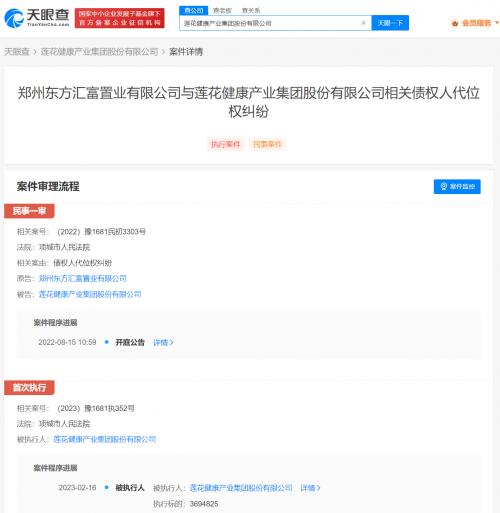 天眼查App显示,近日,莲花健康产业集团股份有限公司新增一则被执行人信息,执行标的369万余元,涉及郑州东方汇富置业有限公司与该公司相关债权人代位权纠纷,执行法院为项城市人民法院。