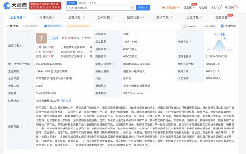 3M中国有限公司成立于1984年11月,法定代表人丁泓禹,注册资本6500万美元,经营范围含第一、二、三类医疗器械生产;研发、生产压敏胶带;汽车快速保养服务、汽车装潢服务及相关咨询服务等。