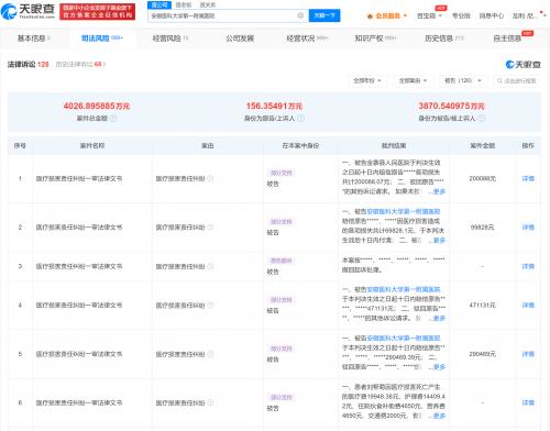天眼查App显示,涉事安徽医科大学第一附属医院开办资金约6.4亿元,宗旨为医疗护理服务,拥有安徽医科大学第一附属医院劳动服务公司、安徽皖健科技开发中心两家公司实际控制权。风险信息显示,该医院关联数百起法律诉讼,其中作为被告身份,且涉及医疗损害责任纠纷的案件就达110余起。多则一审法律文书显示,该医院被法院判决赔偿患者数万元至上百万元不等。