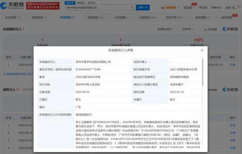 天眼查App显示,近日,深圳市柔宇科技股份有限公司因其他规避执行行为,被深圳市中级人民法院列为失信被执行人(老赖),并被限制高消费。生效法律文书确定的义务显示,柔宇科技公司曾与和力广告公司达成和解协议,约定向后者分两期支付合同欠款110余万元,如未履行任何一期的付款义务,后者有权立即向法院申请强制执行。案件流程显示,去年9月,柔宇科技公司首次被执行,执行标的121万余元。