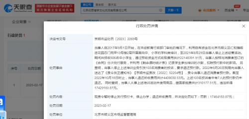 天眼查App显示,近日,北京优思博学文化交流有限责任公司被北京市顺义区市场监督管理局罚款1746万余元。处罚详情显示,当事人自2017年9月开始,在未经教育行政部门审批的情况下,利用自有资金开展面向中、小学的学科类培训,至2021年8月停止上述经营活动,期间共招收806名中小学生,通过预收资金方式收取费用共计2214万余元。当事人停止上述培训业务引发103名消费者的投诉,要求退还预付款。经市监局责令改正,当事人退还所收费用共计440万余元,违法所得1742万余元。