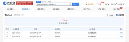 天眼查App显示,近日,海泉基金关联公司北京海纳百泉投资基金管理有限公司新增两则被执行人信息,执行标的共17万元,执行法院为北京金融法院。