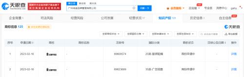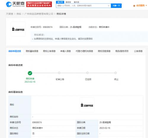 天眼查App显示,近日,王鹤棣品牌公司广州缔造品牌管理有限公司申请注册两枚“D.coffee”图形商标,国际分类涉及广告销售、服装鞋帽,当前商标状态均为申请中。