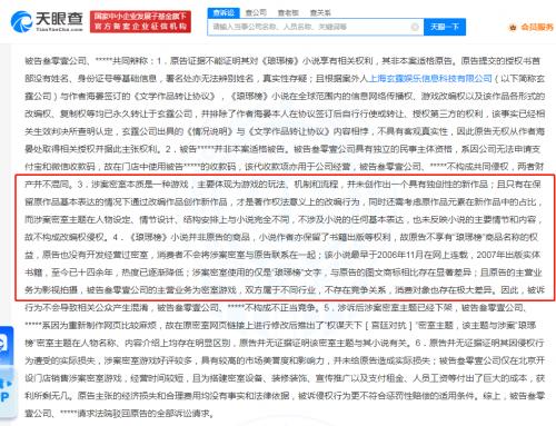 文书显示,原告正午阳光诉称,被告叁零壹公司、梁某某未经授权,在店铺中销售名为“琅琊榜之权谋天下”的密室主题,该密室主题使用了《琅琊榜》小说的主要背景故事、主要角色人物名称、人物关系、故事情节等,严重侵害了原告就《琅琊榜》小说享有的复制权、发行权、改编权及表演权。两被告辩称,涉案密室主题在人物设定、情节设计、结构安排上与小说完全不同,不构成改编权侵权。原告的主营业务为影视拍摄,被告叁零壹公司的主营业务为密室游戏,双方属不存在竞争关系。