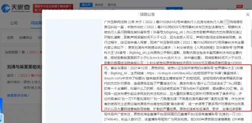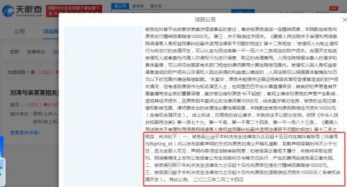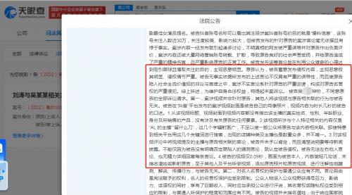 天眼查App显示,近日,广州互联网法院公告刘涛与吴某某网络侵权责任纠纷一案判决书。