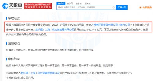 天眼查App显示,近日,湖南旺旺食品有限公司上海分公司与家乐福(上海)供应链管理有限公司仲裁程序中的财产保全一审裁定书公开。