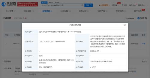 风险信息显示,北京桔子树文化传播有限责任公司存在多个法律诉讼案件,案由多为教育培训合同纠纷。近期,该公司还因教育培训合同纠纷被北京市昌平区人民法院强制执行1.5万元。此外,该公司还曾因未将预收的资金存入存管帐户,违反预付卡管理条例,被罚款4万元。