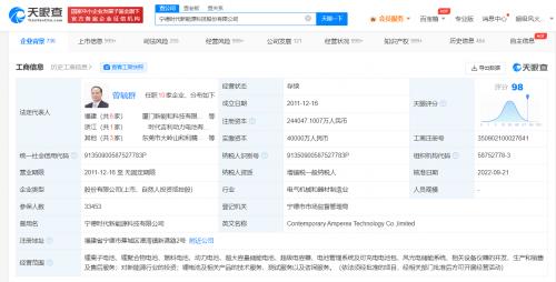 天眼查App显示,宁德时代新能源科技股份有限公司成立于2011年12月,法定代表人为曾毓群