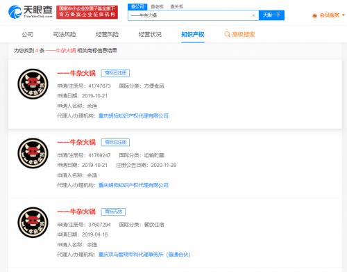 该门店经营者余渔还关联一家重庆小辣娇餐饮管理有限公司,其成立于2021年8月,注册资本50万人民币,2021年年报显示,该公司参保人数为0。此外,知识产权信息显示,余渔曾申请多枚“一一牛杂火锅”商标,国家分类包括方便食品、餐饮住宿、广告销售等,其中2枚已注册成功。