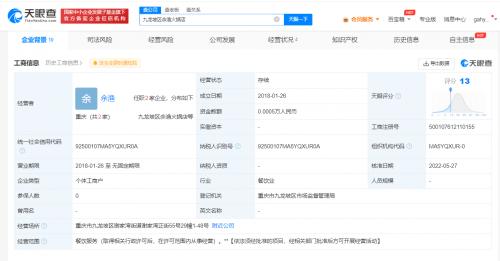 天眼查App显示,涉事门店九龙坡区余渔火锅店成立于2018年1月,经营者为余渔,注册资本5万人民币,企业类型为个体工商户,经营范围为餐饮服务。行政许可信息显示,该个体户于2022年6月取得食品经营许可证,距今不足1年。