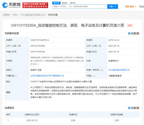天眼查App显示,7月13日,中兴通讯股份有限公司公开“自动驾驶控制方法、装置、电子设备及计算机可读介质”专利,公开号CN113115250A,申请日期为2019年12月。