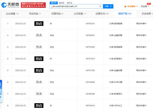天眼查App显示,近日,上海米哈游网络科技股份有限公司申请注册多个“热血”“热”文字及图形新商标,国际分类涉及教育娱乐、服装鞋帽、金融物管等,当前商标状态均为申请中。