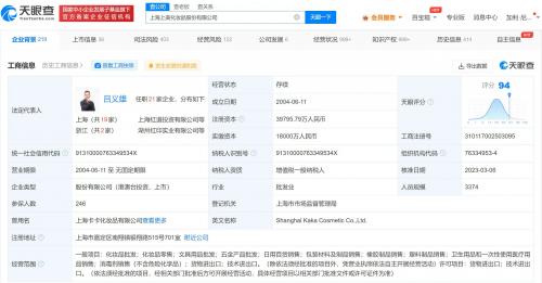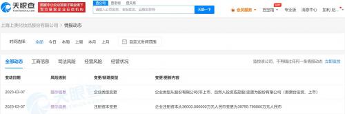 天眼查App显示,近日,上海上美化妆品股份有限公司发生工商变更,注册资本由3.6亿人民币增至约3.98亿人民币,企业类型变更为股份有限公司(港澳台投资、上市)。