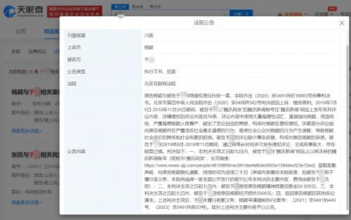 天眼查App显示,近日,北京互联网法院公告杨颖与于某网络侵权责任纠纷一案执行文书。文书显示,被告于某在“腾讯新闻”网站上发布涉嫌侵权的评论内容共76条,评论内容中使用大量侮辱性词汇,直接指向杨颖,用语低俗,严重侮辱杨颖人格尊严,构成对杨颖名誉权侵权。法院判决被告于某在“腾讯新闻”网站上登载致歉声明,并赔偿杨颖精神损害抚慰金5万元及经济损失5000元。上述判决生效后,于某未履行致歉义务,杨颖申请强制执行。