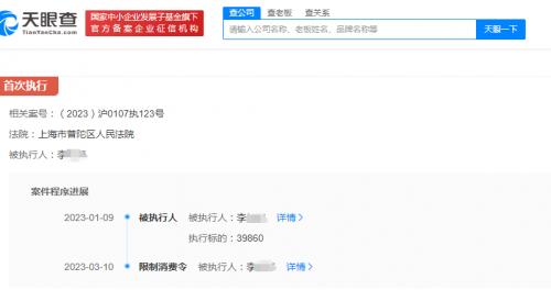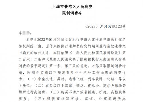 天眼查App显示,近日,李某某因未按执行通知书指定的期间履行生效法律文书确定的给付义务,被上海市普陀区人民法院采取限制消费措施,申请人为虞书欣,关联案件为虞书欣与李某某的名誉权纠纷。据案件流程显示,今年1月,李某某因该案件被强制执行,执行标的3.9万余元。