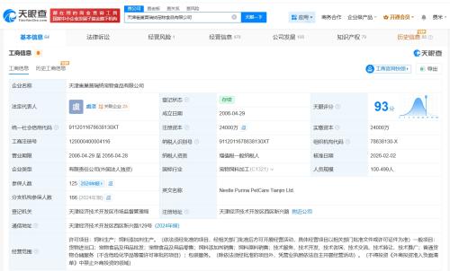 天眼查经营风险信息显示,近日,天津雀巢普瑞纳宠物食品有限公司因臭气浓度超标排放,被天津经济技术开发区生态环境局罚款35万元。天津雀巢普瑞纳宠物食品有限公司成立于2006年4月,法定代表人为...