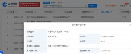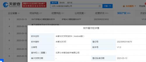 天眼查App显示,近日,北京小米移动软件有限公司“米家3D打印机软件(Android版)”“米家3D打印机软件(iOS版)”软件著作权获登记批准,软件简称为“米家3D打印”,当前版本号均为V1.0。