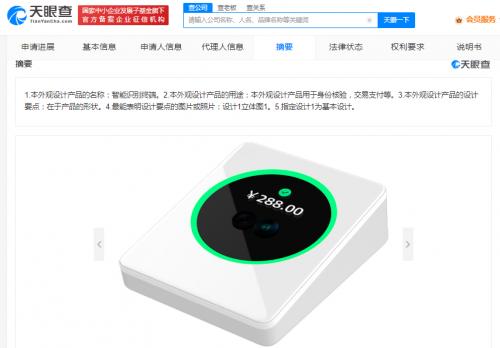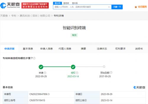 天眼查App显示,3月14日,腾讯科技(深圳)有限公司申请的“智能识别终端”外观专利获授权。摘要显示,本外观设计产品用于身份核验、交易支付等,设计要点在于形状。