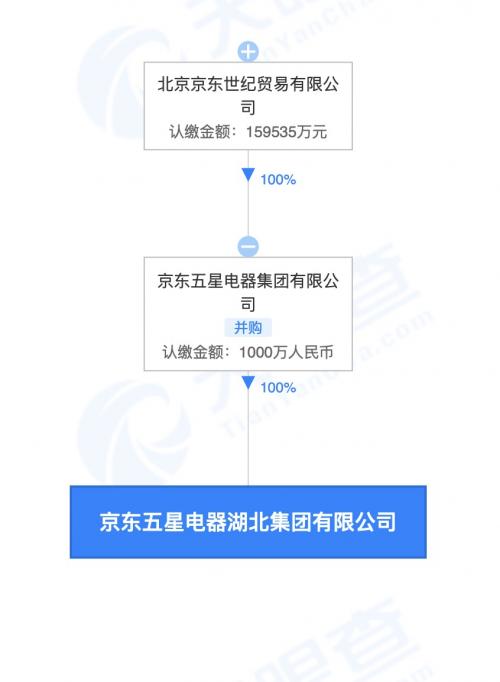 天眼查App显示,近日,京东五星电器湖北集团有限公司成立,法定代表人于鲲,注册资本1000万人民币,经营范围含日用家电零售,新能源汽车电附件销售,助动自行车、代步车及零配件销售,通讯设备修理,餐饮服务等。股东信息显示,该公司由京东五星电器集团有限公司全资持股,后者为北京京东世纪贸易有限公司全资子公司。