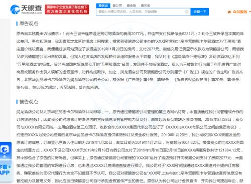 另外,此前,该公司及另一第三方平台曾因旅店服务合同纠纷被起诉,原告樵某通过第三方平台预订该酒店,入住后认为酒店硬件设施和服务水平较差,后查询中国“五星级酒店”名录,发现并不包括该酒店,遂起诉至法院。法院审理认为,第三方平台提供酒店服务时,将未载入“五星级酒店”名录的北京华贸丽思卡尔顿酒店标注为五星级酒店,构成对消费者的欺诈,故判决第三方平台退还原告樵某2077元,并赔偿6231元,北京华贸丽思卡尔顿酒店不承担责任。