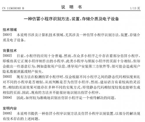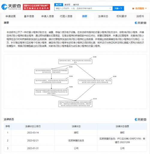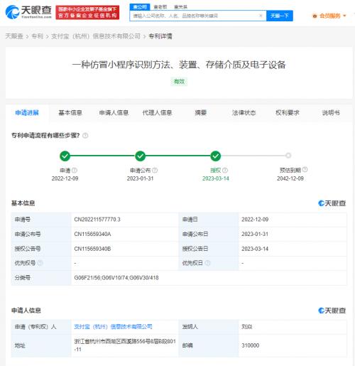 天眼查App显示,近日,支付宝(杭州)信息技术有限公司申请的“一种仿冒小程序识别方法、装置、存储介质及电子设备”专利获授权。