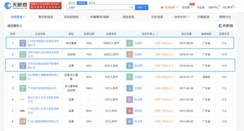 值得注意的是,王逸轩关联的8家存续企业中,包含深圳龙泽瑞生育医疗管理有限公司、广州龙泽瑞医疗信息咨询有限公司,其中前者经营范围包括不孕不育医疗咨询、产前产后医疗咨询等,另一医疗信息咨询公司则包含干细胞技术的研究、人体科学研究成果转让服务等业务。