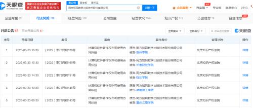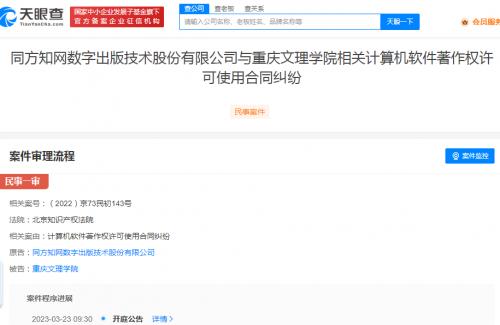 天眼查App显示,近日,同方知网数字出版技术股份有限公司新增多则开庭公告,案由均为计算机软件著作权许可使用合同纠纷,原告为同方知网公司,被告包括贺州学院、长春财经学院、陇东学院、湖南理工学院、重庆文理学院,案件将于3月23日在北京知识产权法院开庭审理。