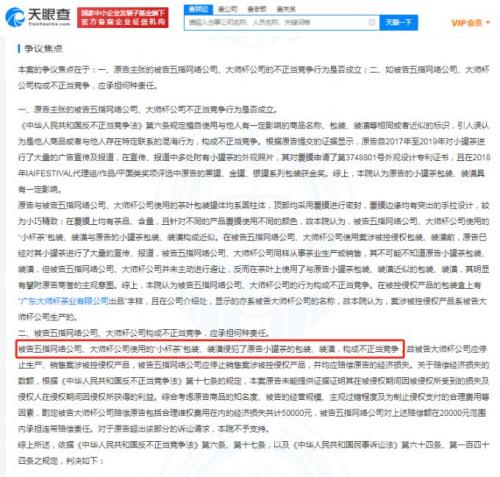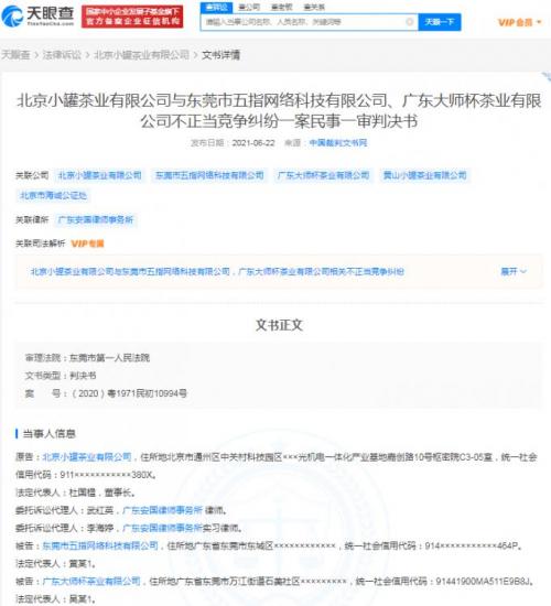 天眼查App显示,6月22日,北京小罐茶业有限公司与东莞市五指网络科技有限公司、广东大师杯茶业有限公司不正当竞争纠纷一案民事一审判决书公开,案号(2020)粤1971民初10994号,审理法院为东莞市第一人民法院。