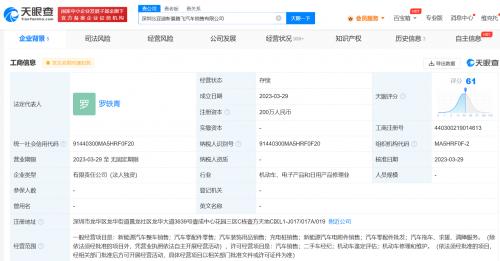 天眼查App显示,3月29日,深圳比亚迪新景腾飞汽车销售有限公司成立,法定代表人为罗轶青,注册资本200万人民币,经营范围包括新能源汽车整车销售;汽车零配件零售;汽车装饰用品销售;充电桩销售;新能源汽车电附件销售;汽车零配件批发;二手车经纪等。股东信息显示,该公司由比亚迪汽车工业有限公司全资持股。