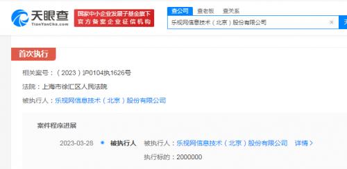 天眼查App显示,近日,乐视网信息技术(北京)股份有限公司新增一则被执行人信息,执行标的200万元,涉及案件为上海五翼文化传播有限公司与该公司相关著作权许可使用合同纠纷,执行法院为上海市徐汇区人民法院。