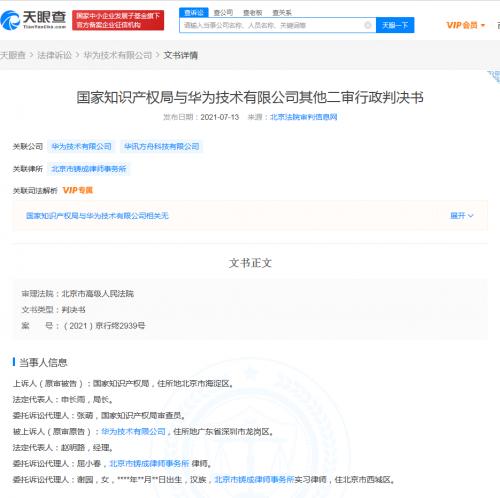 天眼查App显示,7月13日,国家知识产权局与华为技术有限公司其他二审行政判决书公开,案号(2021)京行终2939号,审理法院为北京市高级人民法院,裁判结果为驳回上诉,维持原判。本判决为终审判决。