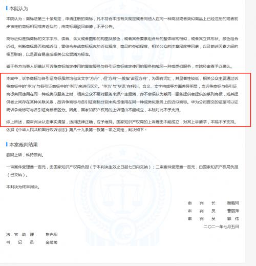 判决书显示,诉争商标为华为在2019年4月申请注册的“华为方舟”商标,引证商标为“华讯方舟”,国家知识产权局曾于2020年驳回诉争商标在复审服务上的注册申请。