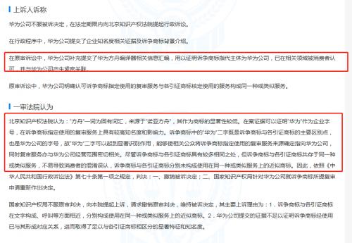 一审法院认为诉争商标中的“华为”可以起到显著识别作用,不易导致消费者的混淆误认,诉争商标与各引证商标分别未构成使用在同一种或类似服务上的近似商标,判决国家知识产权局针对华为公司就诉争商标所提复审申请重新作出决定。