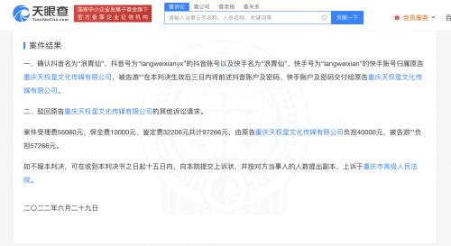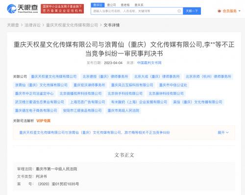 天眼查App显示,近日,重庆天权星文化传媒有限公司与浪胃仙(重庆)文化传媒有限公司、游才梅(游絮)、李杭泽(浪胃仙)不正当竞争纠纷一审判决书公开。